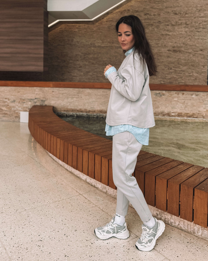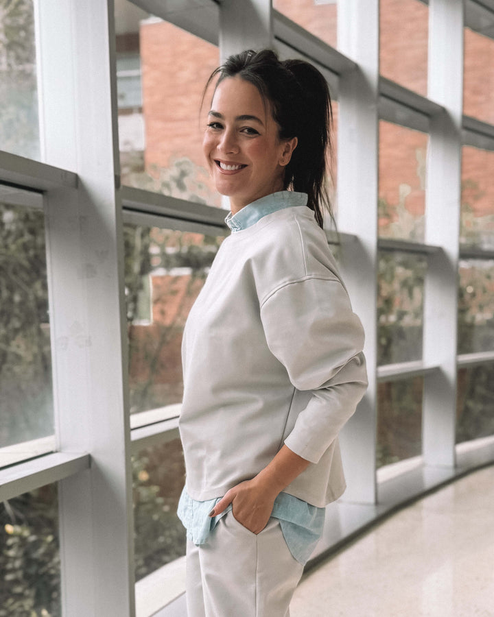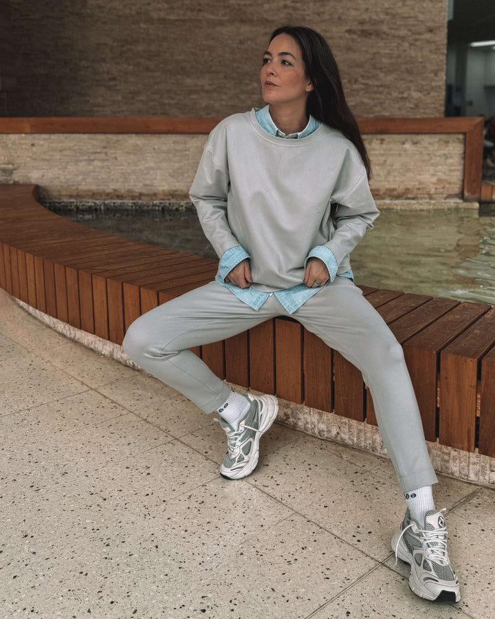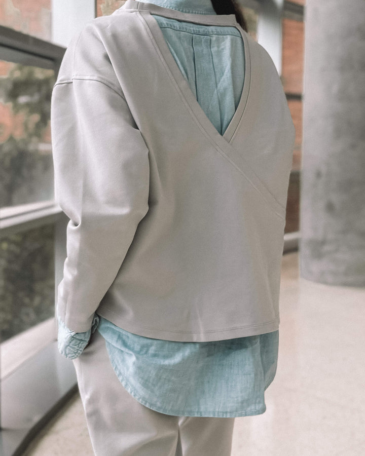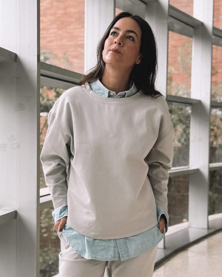 Una silueta clásica al frente, con un giro inesperado en la espalda. Este buzo gris de corte recto redefine lo esencial con un diseño limpio y contemporáneo. Su escote posterior en forma de V profunda aporta un toque audaz y femenino, ideal para elevar cualquier look.