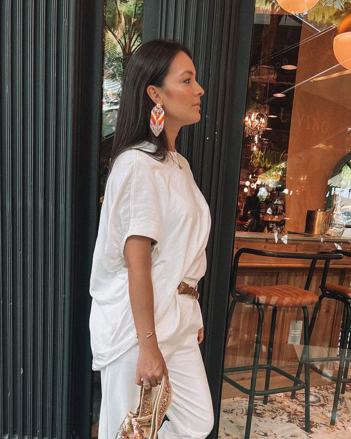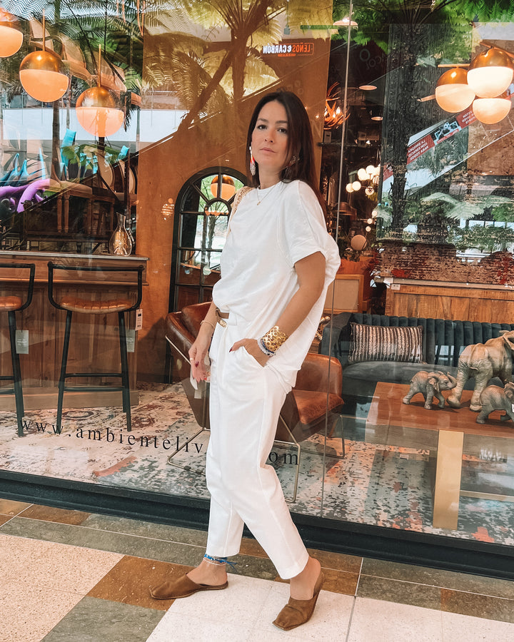 Camiseta oversized beige con dos telas, la del frente es 69% Rayón, 27% Nylon y 4% Spandex. Es perfecta par cualquier ocasión, pueden usarla con pantalones ajustados, falda o un pantalon campana.