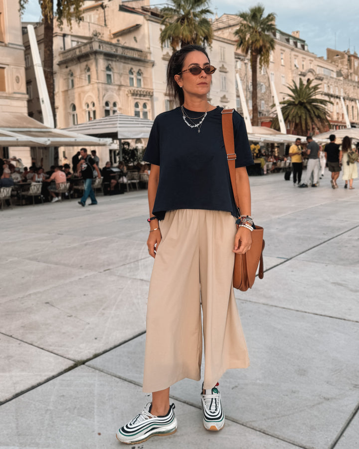 Su corte amplio tipo culotte crea una silueta fluida y moderna con cortes limpiosque reflejan el espíritu effortless y comfy chic de la marca. La pretina elásticaasegura un ajuste versátil que se adapta a diferentes tipos de cuerpo, manteniendo la caída natural y equilibrada del diseño, ofrece una textura técnica y ligera que combina elasticidad, estructura y comodidad.