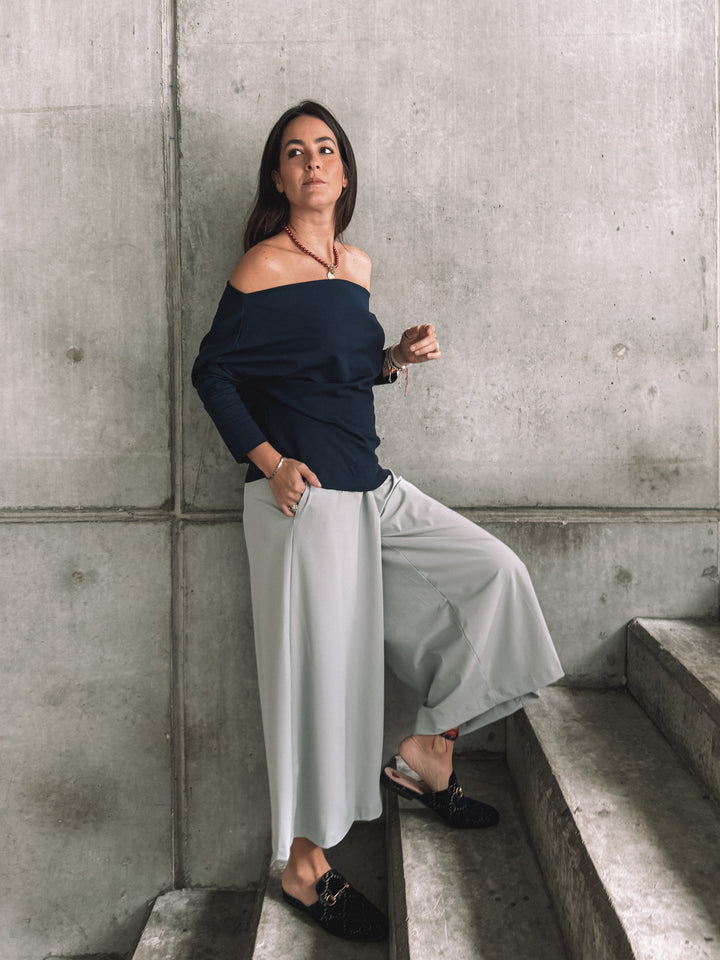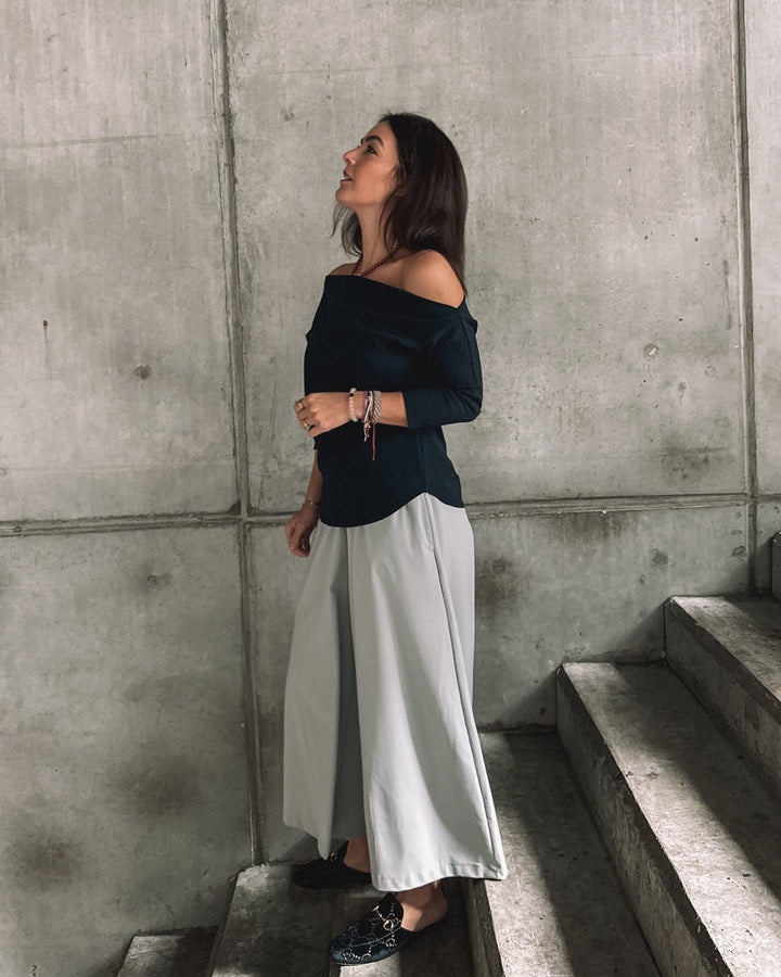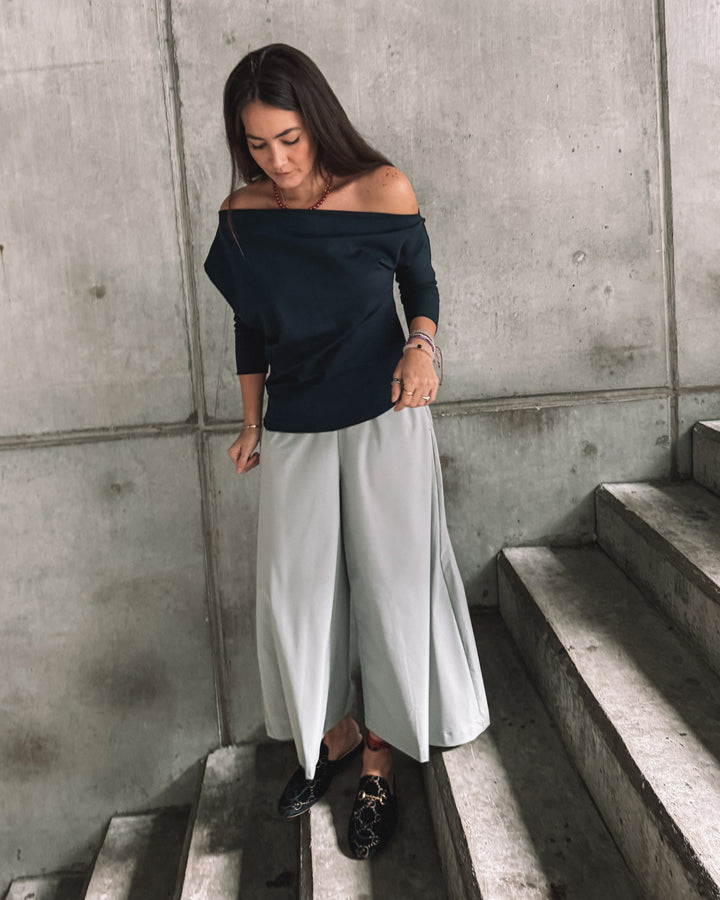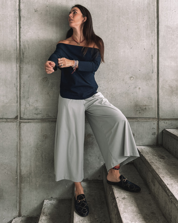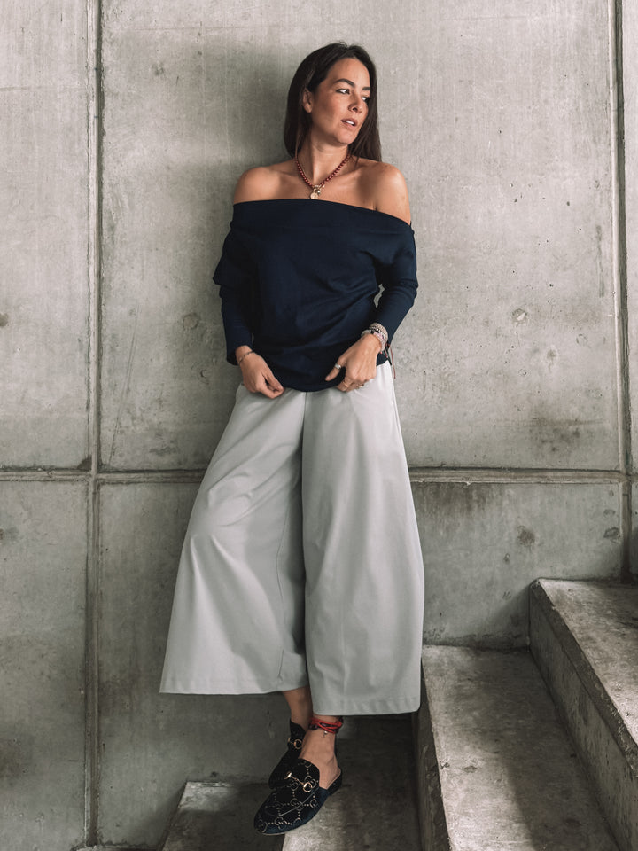 Su corte amplio tipo culotte crea una silueta fluida y moderna con cortes limpiosque reflejan el espíritu effortless y comfy chic de la marca. La pretina elásticaasegura un ajuste versátil que se adapta a diferentes tipos de cuerpo, manteniendo la caída natural y equilibrada del diseño, ofrece una textura técnica y ligera que combina elasticidad, estructura y comodidad.