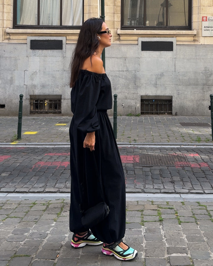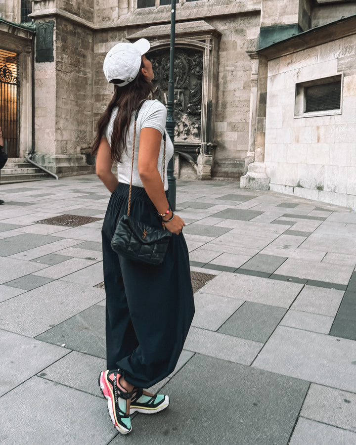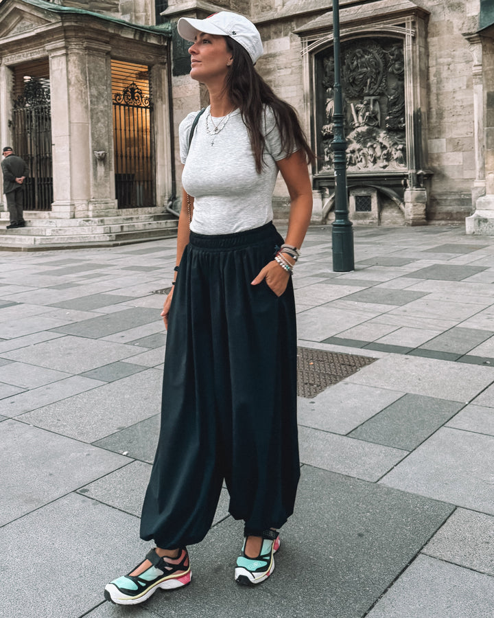 El diseño de corte amplio y tobillos ajustados crea una silueta fluida tipo aladino, equilibrando comodidad y estilo. Su pretina elástica permite un ajuste natural que se adapta a tu cuerpo y a tu ritmo — del estudio a la ciudad, del viaje al día a día.